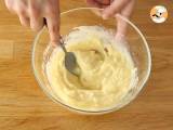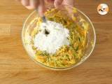 Geben Sie das Gemüse zum Püree und vermischen Sie es gut. Das Mehl hinzufügen und gut vermischen.