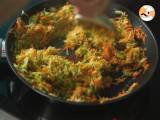 Die ungeschälten Zucchini und die geschälten Karotten reiben und in etwas Olivenöl etwa 5 Minuten anbraten.