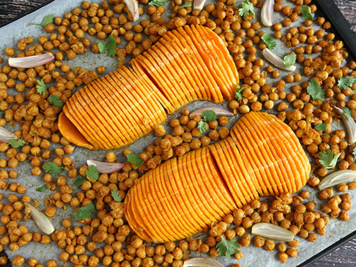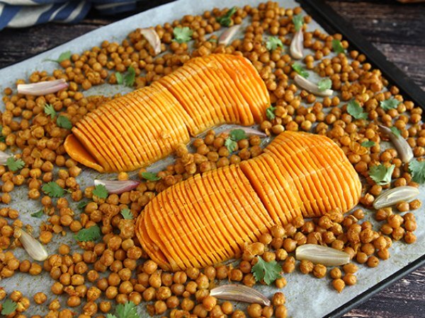 30 Minuten bei 180 °C backen. - In der Zwischenzeit die Kichererbsen abtropfen lassen und mit den restlichen 3 Esslöffeln Olivenöl und den Gewürzen vermischen.