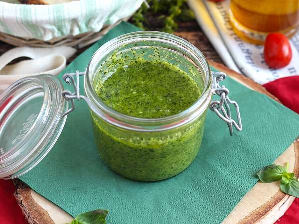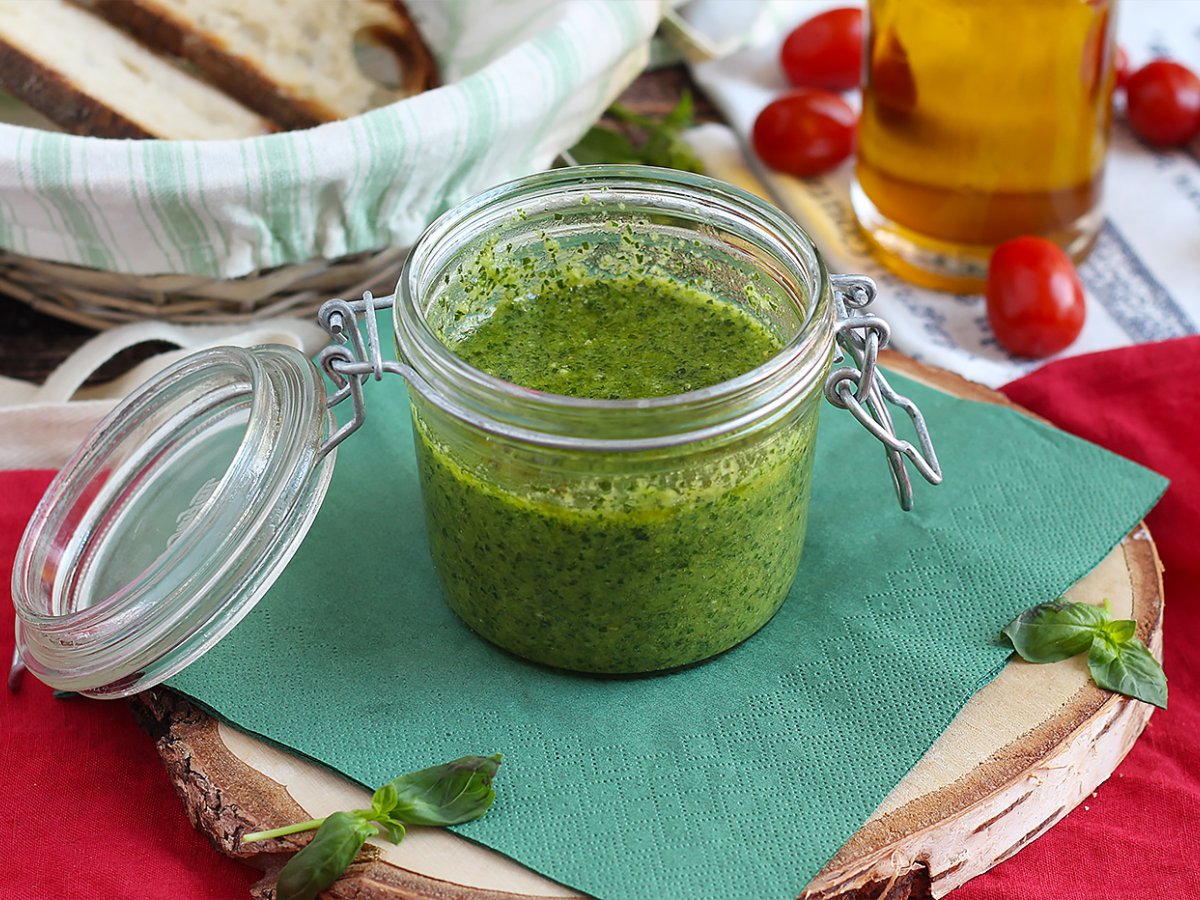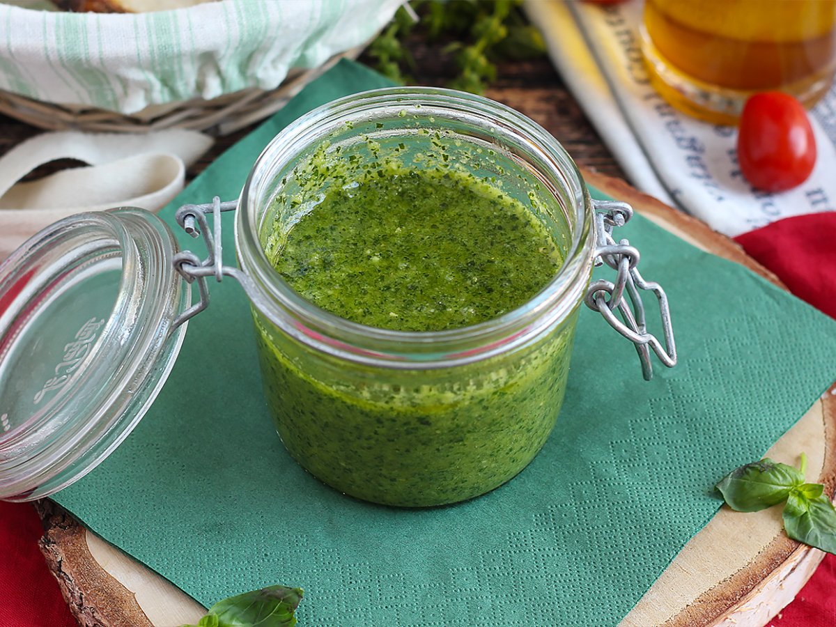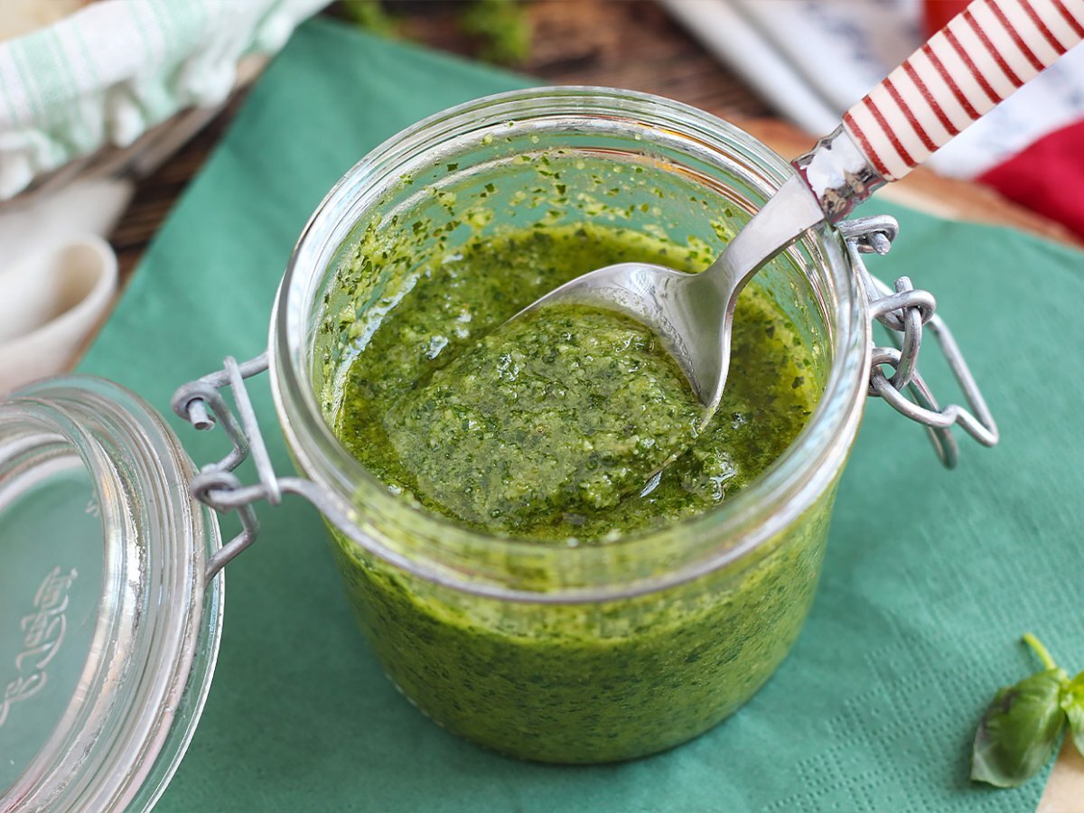 Bewahren Sie Ihr Pesto in einem luftdichten Glas auf: Bedecken Sie die Pesto-Sauce immer mit Olivenöl, damit sie länger haltbar ist.