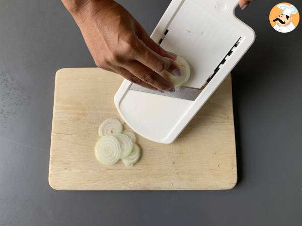 Schneiden Sie sie dann mit einem Messer oder einer Mandoline gleichmäßig durch.