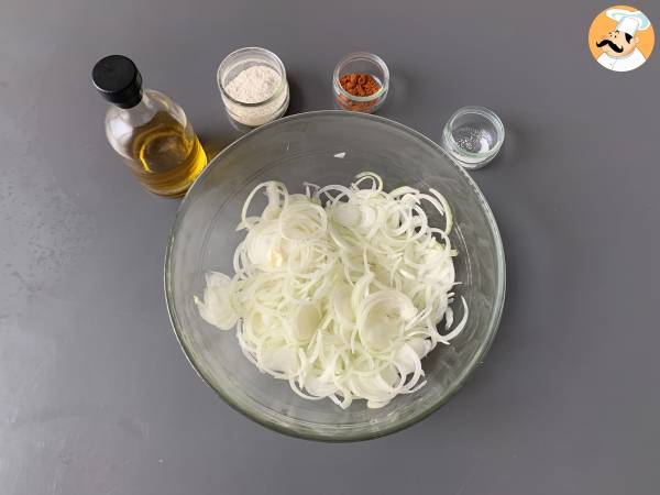 Die gehackten Zwiebeln in eine Schüssel geben. Mehl, Salz, Paprika und Olivenöl hinzufügen.