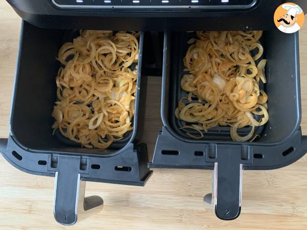 In beiden Fällen ist die Zeit, bis sie goldbraun ist, abhängig von der Dicke der Zwiebel. Denken Sie daran, den Korb alle 5 Minuten zu schütteln, um sicherzustellen, dass alles gleichmäßig ist.