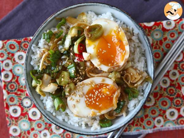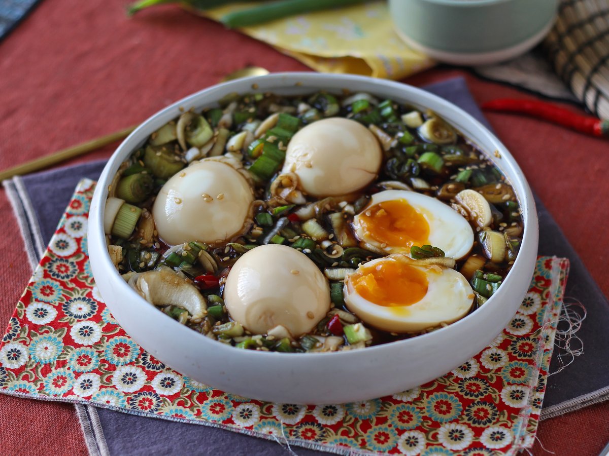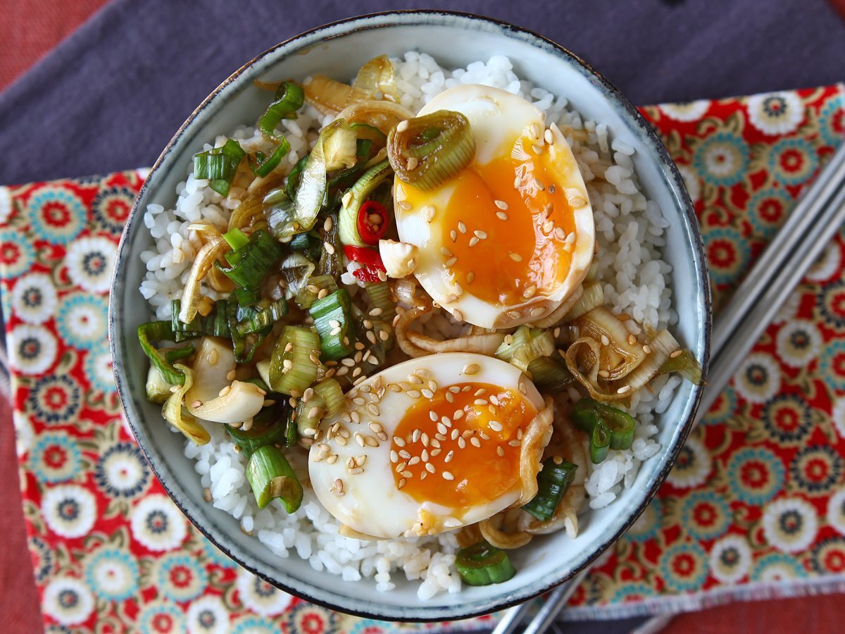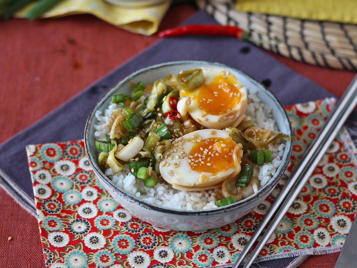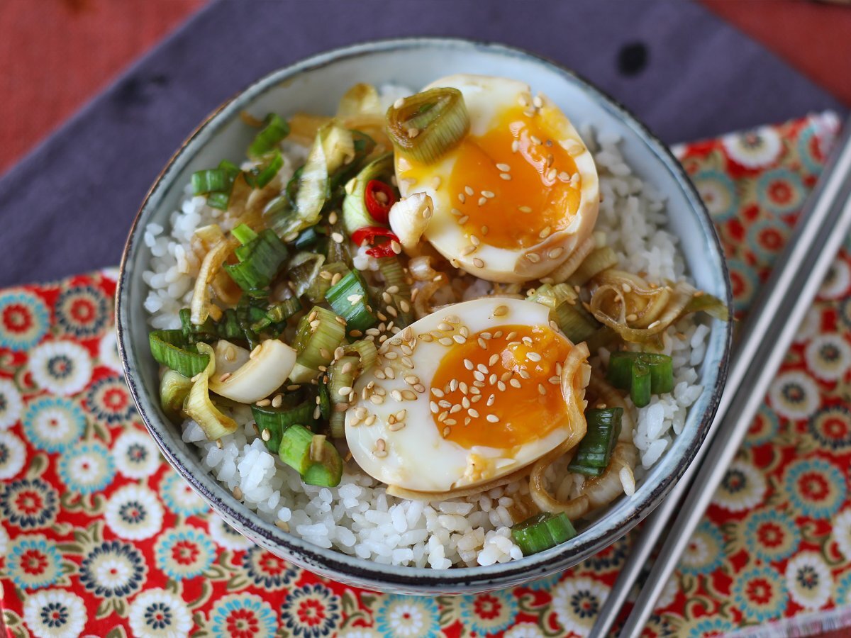 Sie können die Eier mit Sushi-Reis servieren. Geben Sie die halbierten Eier auf Ihre Reisschüssel, übergießen Sie sie mit der Sauce und den Marinade-Zutaten und lassen Sie es sich schmecken.