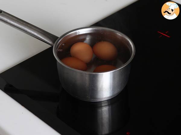 Eier (Zimmertemperatur) in kochendem Wasser 6 Minuten und 30 Sekunden lang kochen.