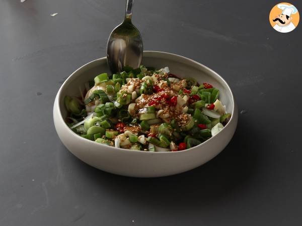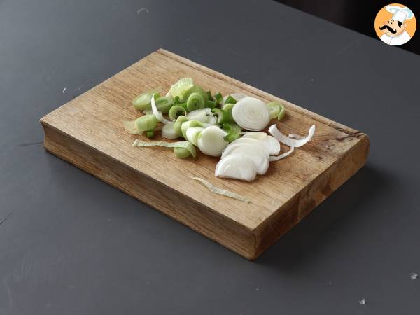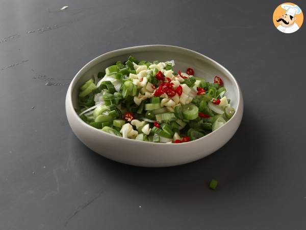 Frühlingszwiebeln, Chilischoten und Knoblauchzehen in kleine Stücke schneiden.