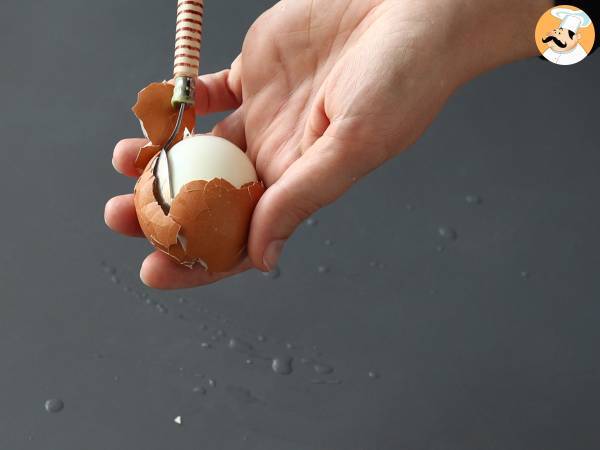 *Mit einem Teelöffel auf das Ei klopfen. Führen Sie den Löffel dann unter die Schale und gehen Sie um das Ei herum, um die Schale vorsichtig zu entfernen.