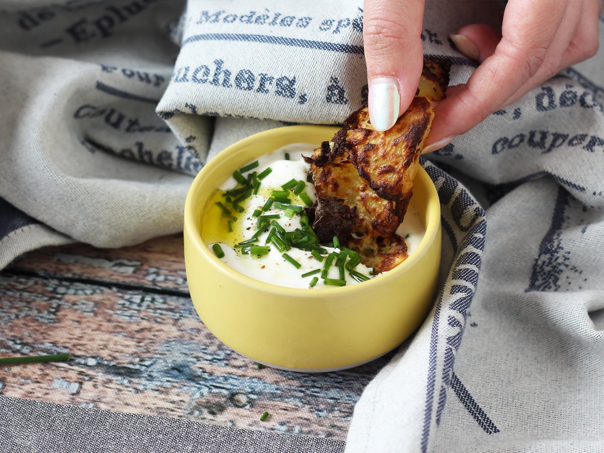 Und schon können Sie sie mit frischem Schnittlauch bestreuen und mit einer Joghurtsoße servieren - guten Appetit!