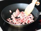 Das Wasser mit dem Brühwürfel zum Kochen bringen. Beiseite legen. Den Speck in einer heißen Pfanne anbraten.