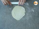 15 Minuten bei Zimmertemperatur unter einem Handtuch ruhen lassen. Den Teig bemehlen und in 8 Stücke schneiden. Rollen Sie die Stücke zu Kugeln und verteilen Sie diese dünn.