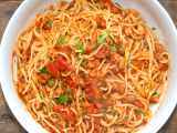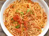 Zutaten: 125g Spaghetti, z.B. aus Vollkorn 100g Bratlingsmischung "Marokkanischer Burger" von Alnatura 125ml kochendes Wasser 1 Zwiebel 1/2 Knoblauchzehe 1...