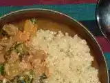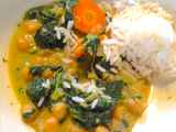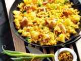 Zutaten: 2 kleine Zwiebeln 2 Frühlingszwiebeln 1 Möhre 4 EL Sonnenblumenöl 200 g Risottoreis 0,4 l Gemüsebrühe 1-2 EL Curry Kreuzkümmel Koriander 400 g...