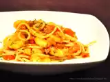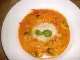 Zutaten: 120g Spaghetti, z.B. Dinkelspaghetti 250gTomaten 1 kleine Knoblauchzehe 1 Packerl Partygarnelen etwas Curry, scharf 2-3 EL Currysoße, Salz Pfeffer...