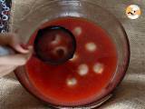 Grenadine, Zitronensaft und rote Lebensmittelfarbe hinzufügen. Die Litschi-Augen hinzufügen. Gut mischen.