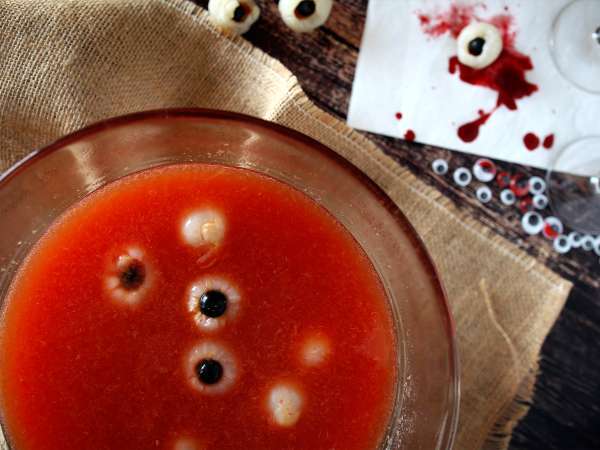Neben Litschis und Blaubeeren können Sie auch Trauben, Himbeeren oder Erdbeeren verwenden, um den Cocktail noch gruseliger zu gestalten.