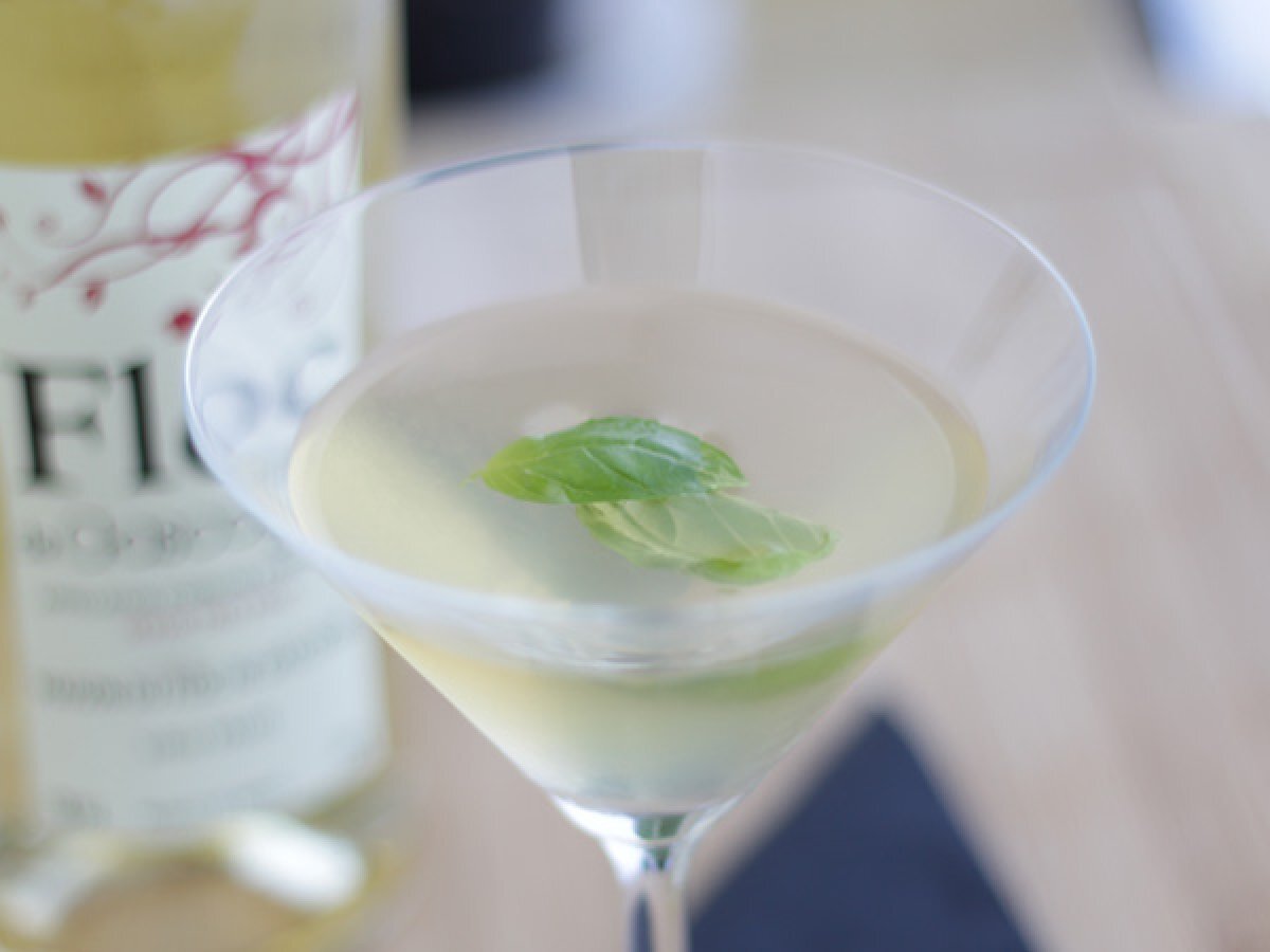 Um den Cocktail Floc Beauty zuzubereiten, geben Sie einfach alle Zutaten in einen Cocktailshaker, schließen ihn und schütteln gut. Servieren Sie ihn in einem Martiniglas und dekorieren Sie ihn mit Basilikumblättern.