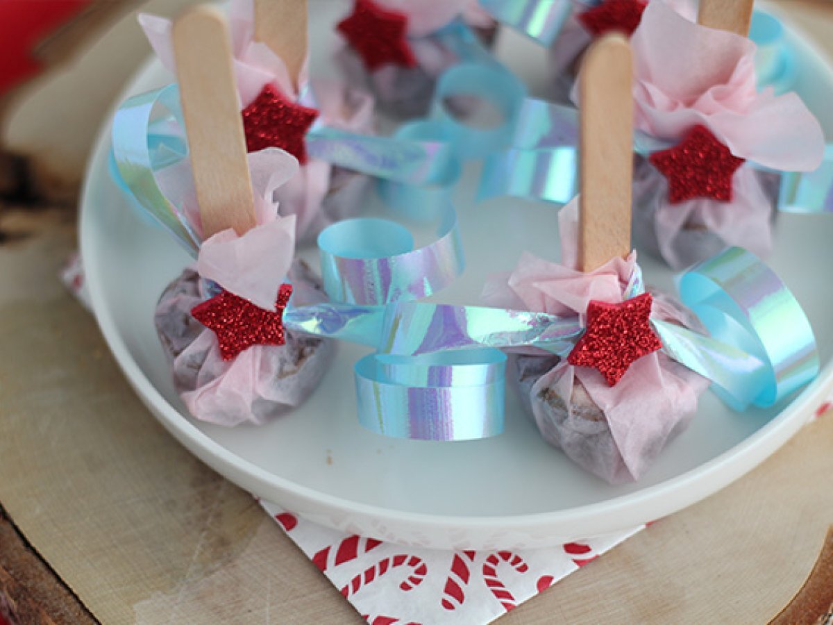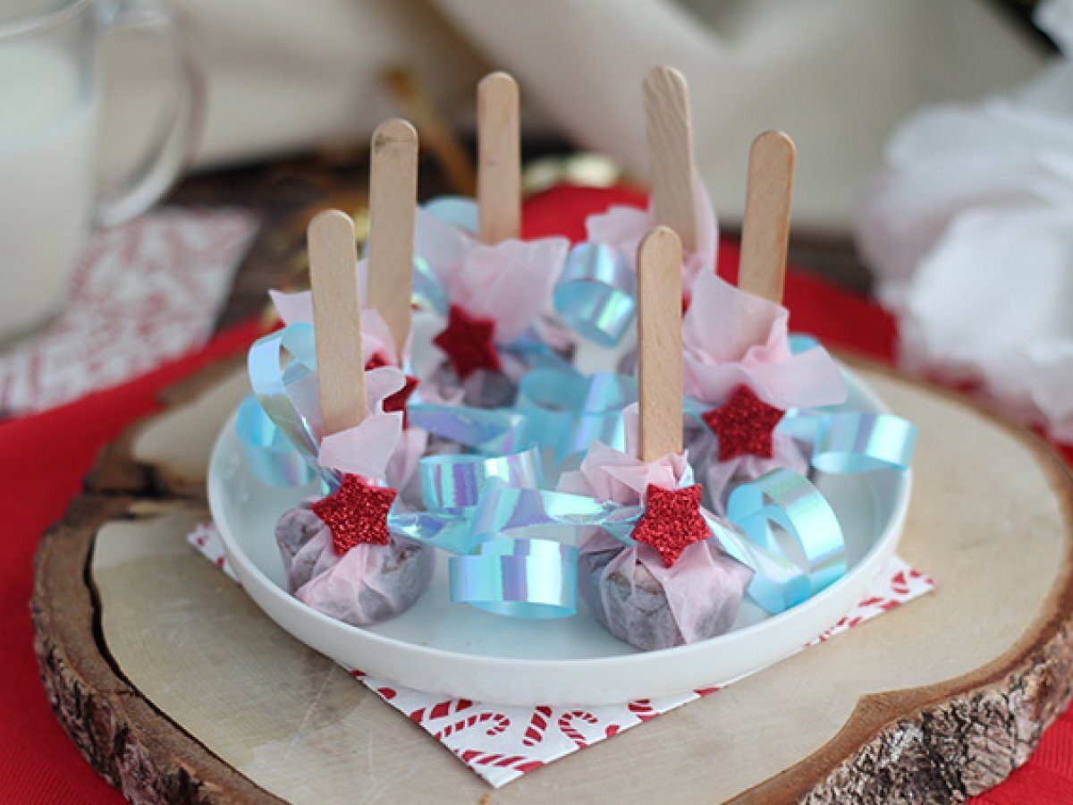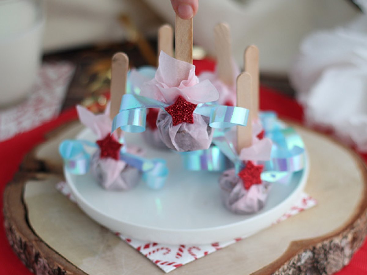 Die Pralinen aus der Form lösen und auf Krepppapierquadrate legen. Das Papier um das Stäbchen falten und mit einem Bolduc verschließen. Das Bolduc mit einer Schere schlingen und einen Sticker auf den Knoten kleben.