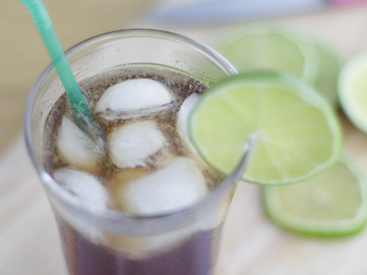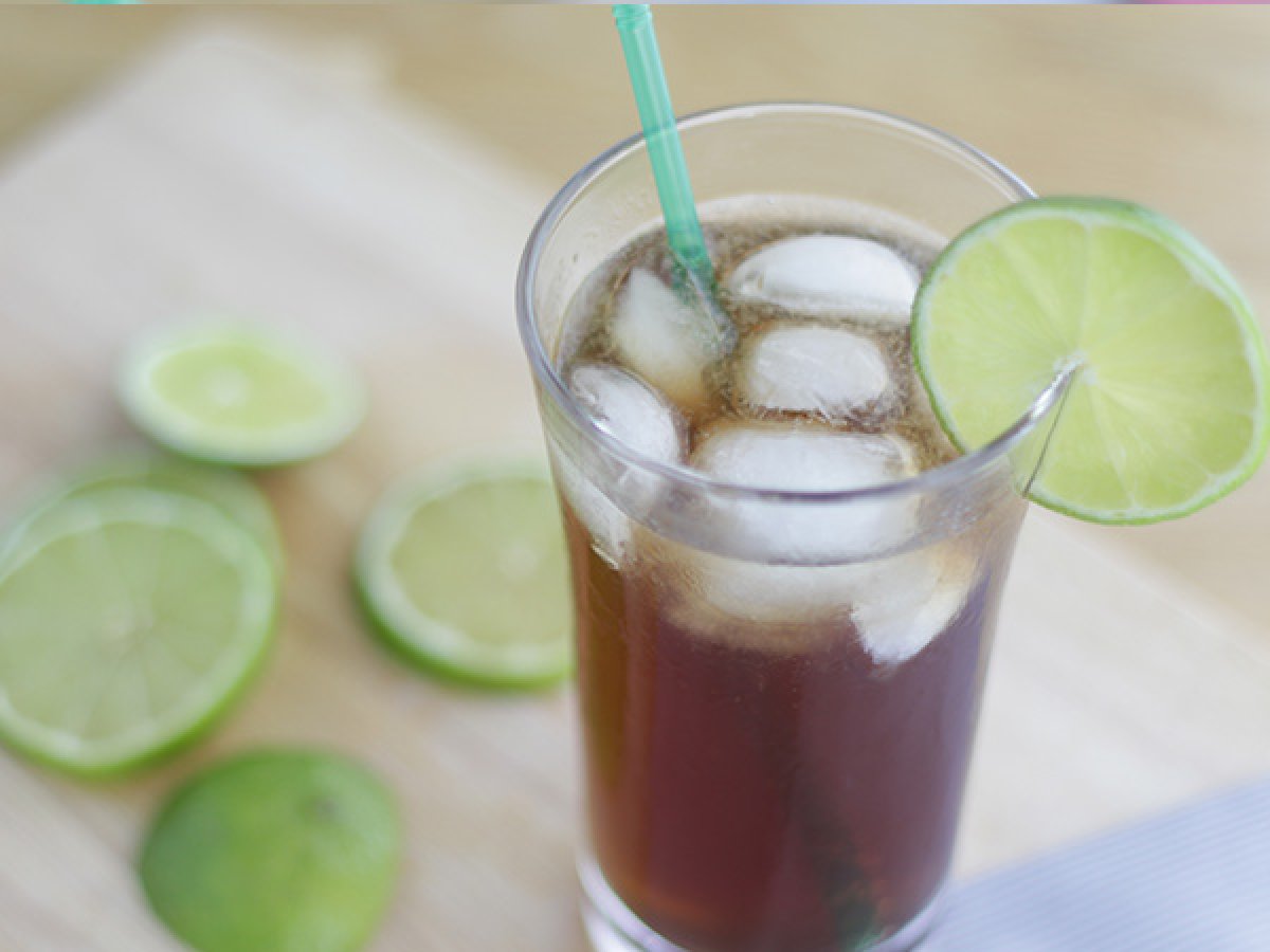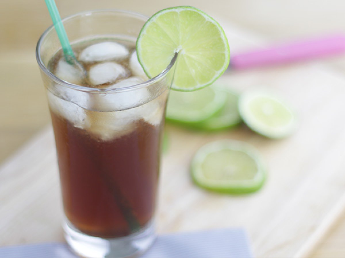 Servieren Sie in einem Tumbler-Glas (wie auf den nebenstehenden Fotos) und füllen Sie es zum Schluss mit Cola auf.