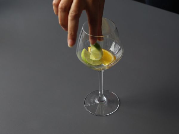 Einen kleinen Schuss Orangenlikör direkt in das Glas gießen. Dann eine halbe Orangenscheibe und eine halbierte Zitronenscheibe hinzufügen.