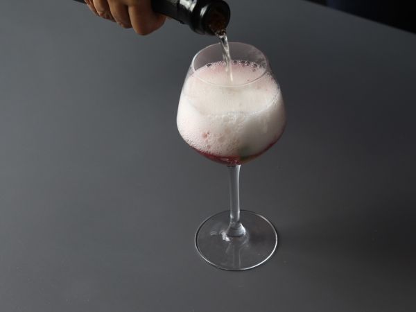 Wenn Sie möchten, können Sie einen Spritzer Orangensaft und Tonic Water hinzufügen. Mit Sekt auffüllen. Mischen ist nicht nötig.