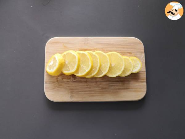 Waschen Sie die Zitrone gut, indem Sie die Schale mit den Fingern auspressen (verwenden Sie am besten eine Bio-Zitrone). Schneiden Sie sie dann in Scheiben.