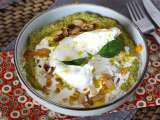 Zutaten: Für die Sauerrahm-Basilikum-Mousse: 1 Töpfchen Basilikum 210 ml Schlagsahne 100 gr. Sauerrahm 1/2 Limette, der Saft 1 Blatt Gelatine Salz Für die...