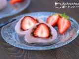 Zutaten: 100 g shiratamako 80 g sugar 170 ml water potato starch 8 strawberries nutella or other hazelnut chocolate spread as required red food colouring