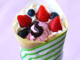 Zutaten: 150 g Mehl 200 ml Milch 50 g geschmolzene Butter 2 Eier eine Prise Salz 4 Kugeln Erdbeereis 8 -10 frische Erdbeeren ein paar Blaubeeren Sahne nach...