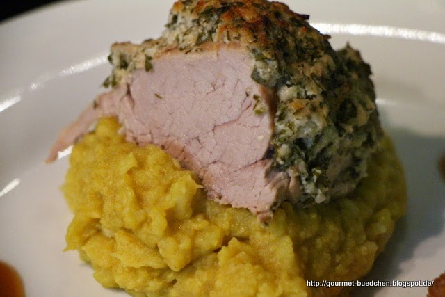 Es wird würzig, Schweinefilet im Kräutermantel, Blumenkohlcurrypüree usw. usw….würzig halt...