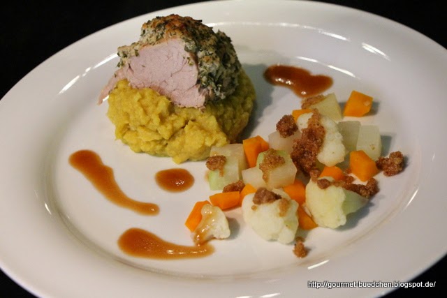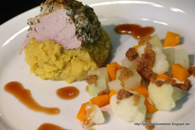 Schweinefilet im Kräutermantel auf Blumenkohlcurrypüree an würzigem Knuspergemüse mit brauner Sauce