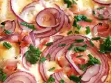 Zutaten: Für den Teig: 500g Mehl 300 ml lauwarmes Wasser 1 Päckchen Trockenhefe etwas Salz 1 teeloffel Puderzucker Für den Belag: 1 Becher saure Sahne 2...