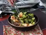Zutaten: 250 g Garnelen 2 Esslöffel Sojasauce Saft von 1 Zitrone 1 Teelöffel Ingwerpulver 2 Knoblauch 1/2 Teelöffel Pfeffer 1 Brokkoli 3 Mohrrüben 1...