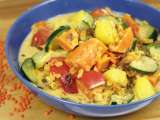 Zutaten: 4 EL Erdnussöl 625 g Hähnchenbrustfilet, 1 1/2 TL Chillipulver 1/2 TL gemahlenes Kurkuma 1/2 TL Salz 600 ml Kokosnussmilch 300 ml Hühnebrühe 50 g...
