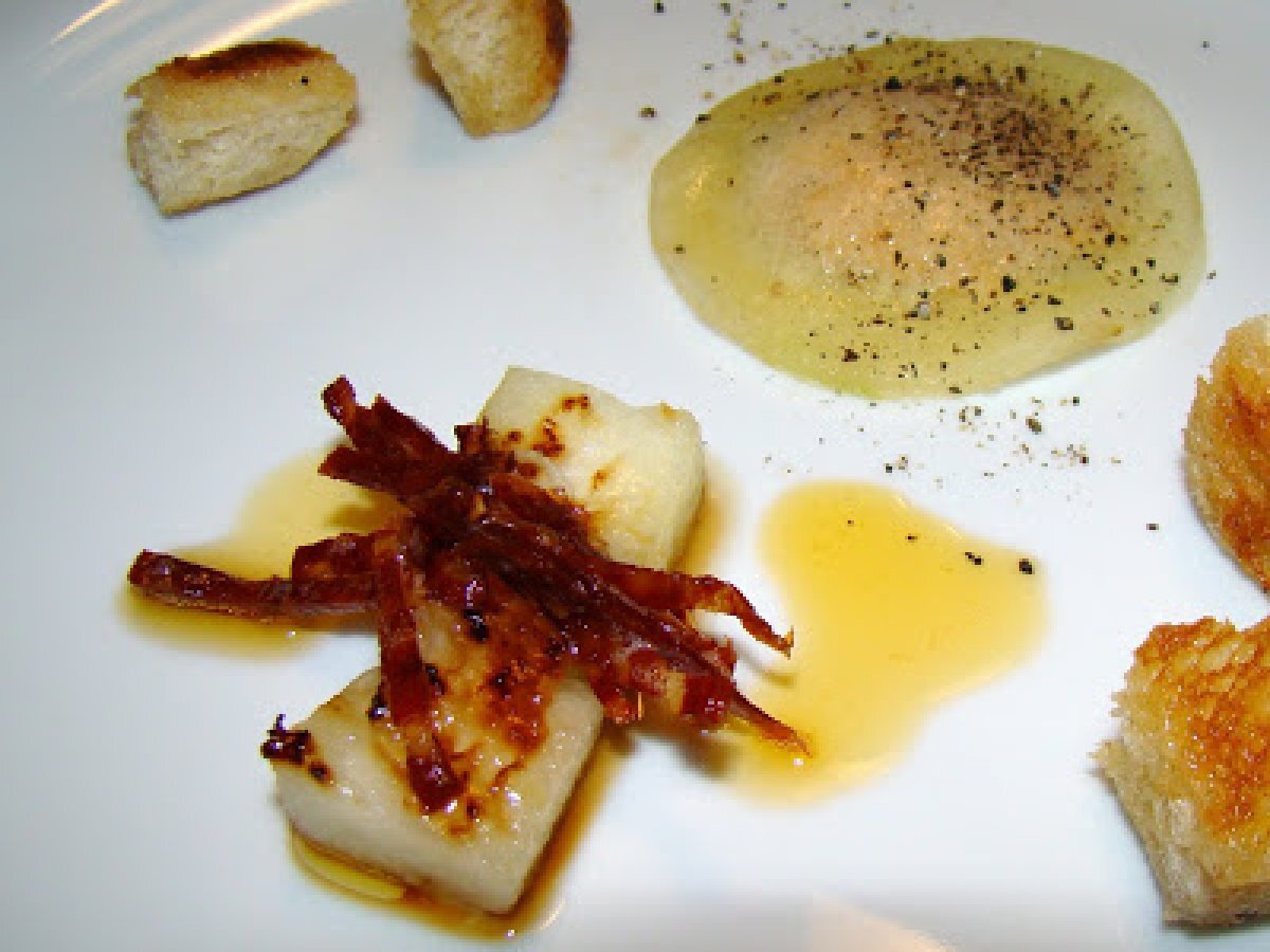 Die Melonensaft marinieren 2 Stunden püriert und tupfen mit Ravioli zu Hobeln sehr dünn Gänseleberparfait. - Verdrängen ca. Melonenform mit Mandoline, cool, vor dem servieren auf einer Umgebungstemperatur zu bringen.