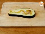 Schneiden Sie Auberginenscheiben in Längsrichtung. Legen Sie die Scheiben auf einer Platte mit Backpapier bedeckt. Gießen Sie etwas Olivenöl hinzu, salzen und pfeffern.