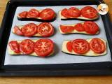 Tomatenscheiben darauf legen und bei 210°C 35 Minuten lang in den vorgeheizten Ofen stellen.