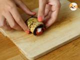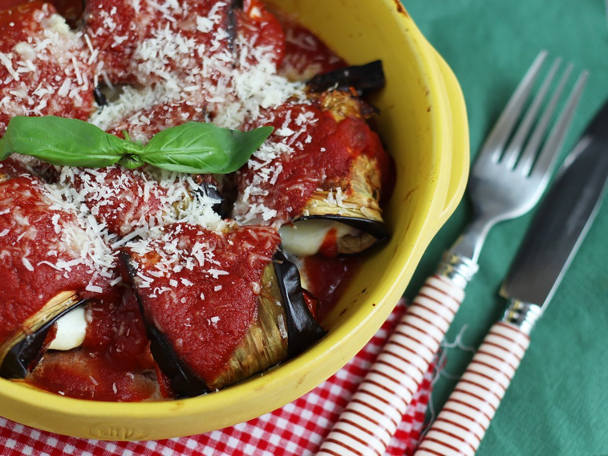 Die Auberginen abkühlen lassen. Legen Sie eine Scheibe Mozzarella auf jede Scheibe Auberginen und rollen Sie die ganze.