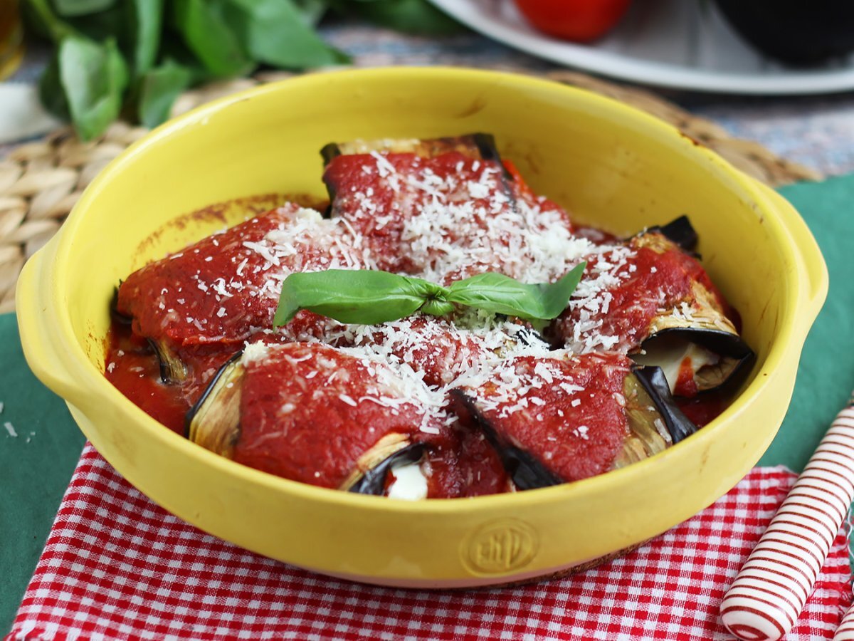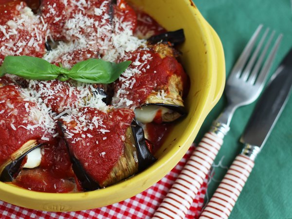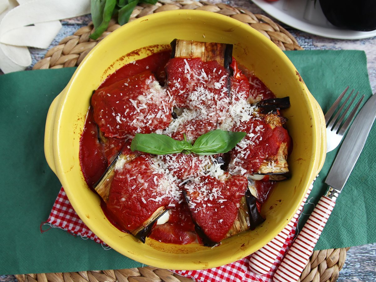 Die gerollten Scheibenin eine Bratpfanne geben, mit Tomatensauce bedecken und mit geriebenem Parmesan bestreuen. 10 min bei 210°C backen.