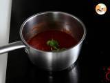 Tomatensauce und ein paar Basilikumblätter dazugeben, mit Salz würzen und bei schwacher Hitze 30 Minuten köcheln lassen.