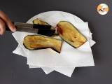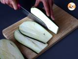 In der Zwischenzeit die Auberginen waschen und die Enden abschneiden. Schneiden Sie sie der Länge nach in etwa 5 mm dicke Scheiben (Sie können auch eine verstellbare Mandoline verwenden).