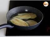 Erhitzen Sie das Frittieröl in einer Pfanne mit hohem Rand und braten Sie die Auberginenscheiben paarweise an (oder mehr, wenn Ihre Pfanne größer ist).