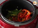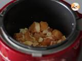 Schalten Sie den Cookeo ein und stellen Sie ihn auf den Modus "Bräunen" ein. Wenn der Behälter vorgeheizt ist, das Olivenöl hineingeben, die Zwiebeln und das Hähnchen hinzufügen. Unter Rühren 2 bis 3 Minuten anbraten lassen.