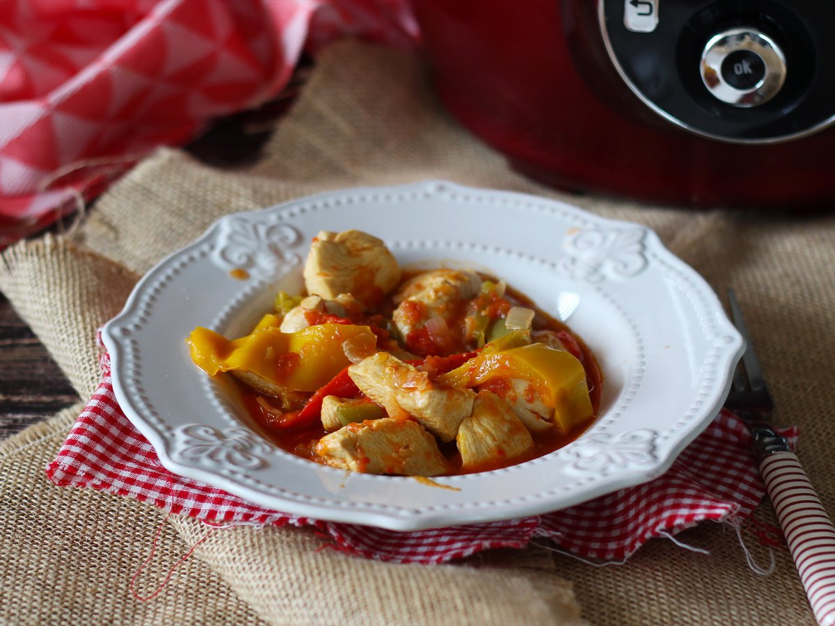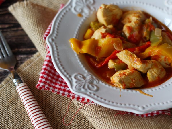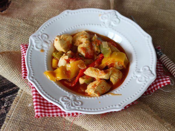 Sie benötigen Olivenöl, Zwiebel, Hähnchenfleisch, Tomatenfruchtfleisch, verschiedene Paprikaschoten, Salz, Pfeffer, Cayennepfeffer und Wasser.