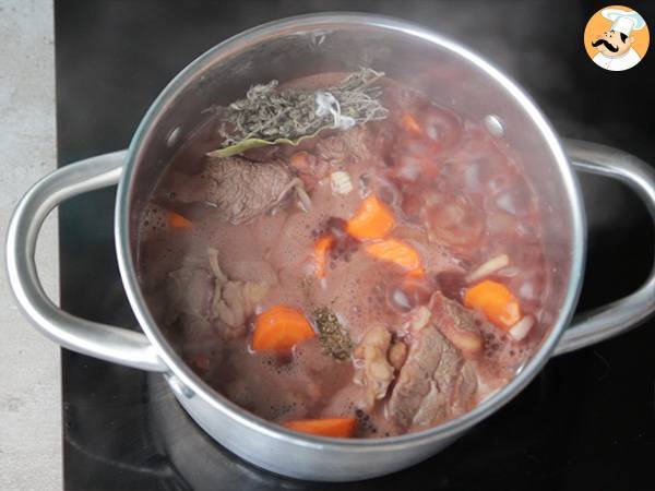 Dann mit Wein bedecken und die in Scheiben geschnittenen Karotten, die zuvor gekochten Speckstücke, die gehackte Knoblauchzehe und das Bouquet garni hinzufügen.