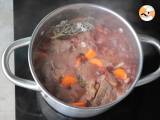 Wenn das Fleisch nach dieser Garzeit immer noch nicht zart ist (schneiden Sie ein scharfes Messer in ein Stück), kochen Sie es, bis dies der Fall ist. Achten Sie dabei darauf, den Topf abzudecken, damit der Wein nicht zu stark einkocht.