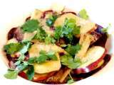 - Für das Dressing die Frühlingszwiebeln in feine Ringe schneiden. Senf, Olivenöl, Essig und Frühlingszwiebeln vermischen und mit Salz und Pfeffer abschmecken.