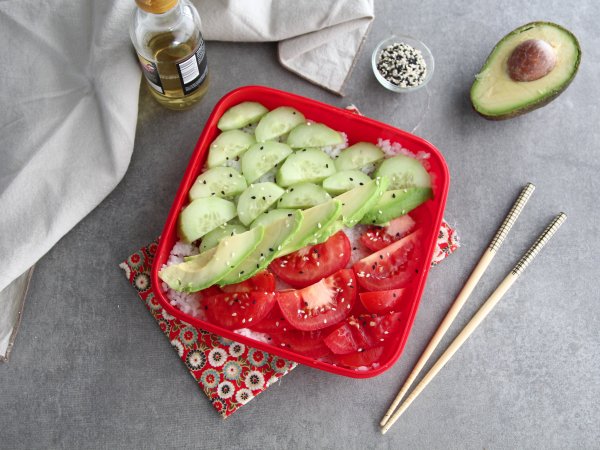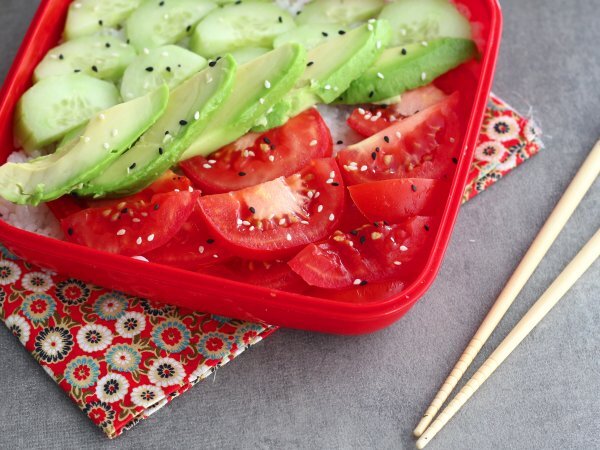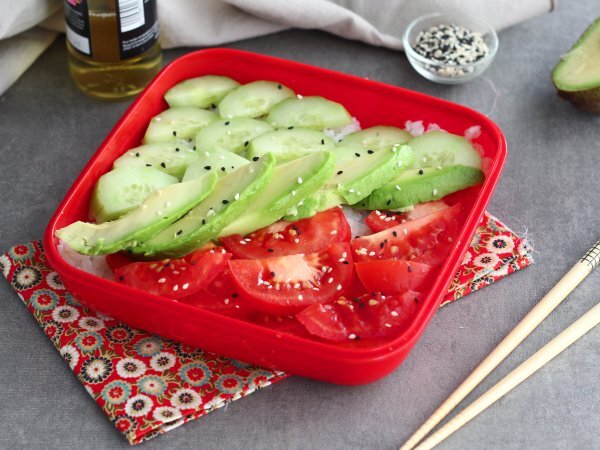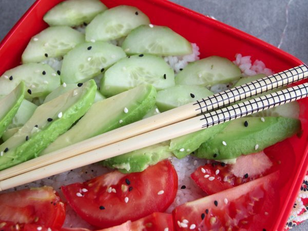 In einer Bento-Box (Sie können auch eine Schüssel oder einen tiefen Teller verwenden) den Reis unten anordnen, die Gurken-, Tomaten- und Avocadostücke darauf legen und mit Sesam bestreuen. Mit Sojasauce abschmecken. - Es ist fertig! bon appétit !