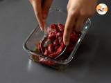 Das Fleisch in Streifen schneiden und in einen Behälter geben. Gießen Sie die Marinade ein, mischen Sie und verschließen Sie den Behälter luftdicht. 1 Stunde kühl stellen.