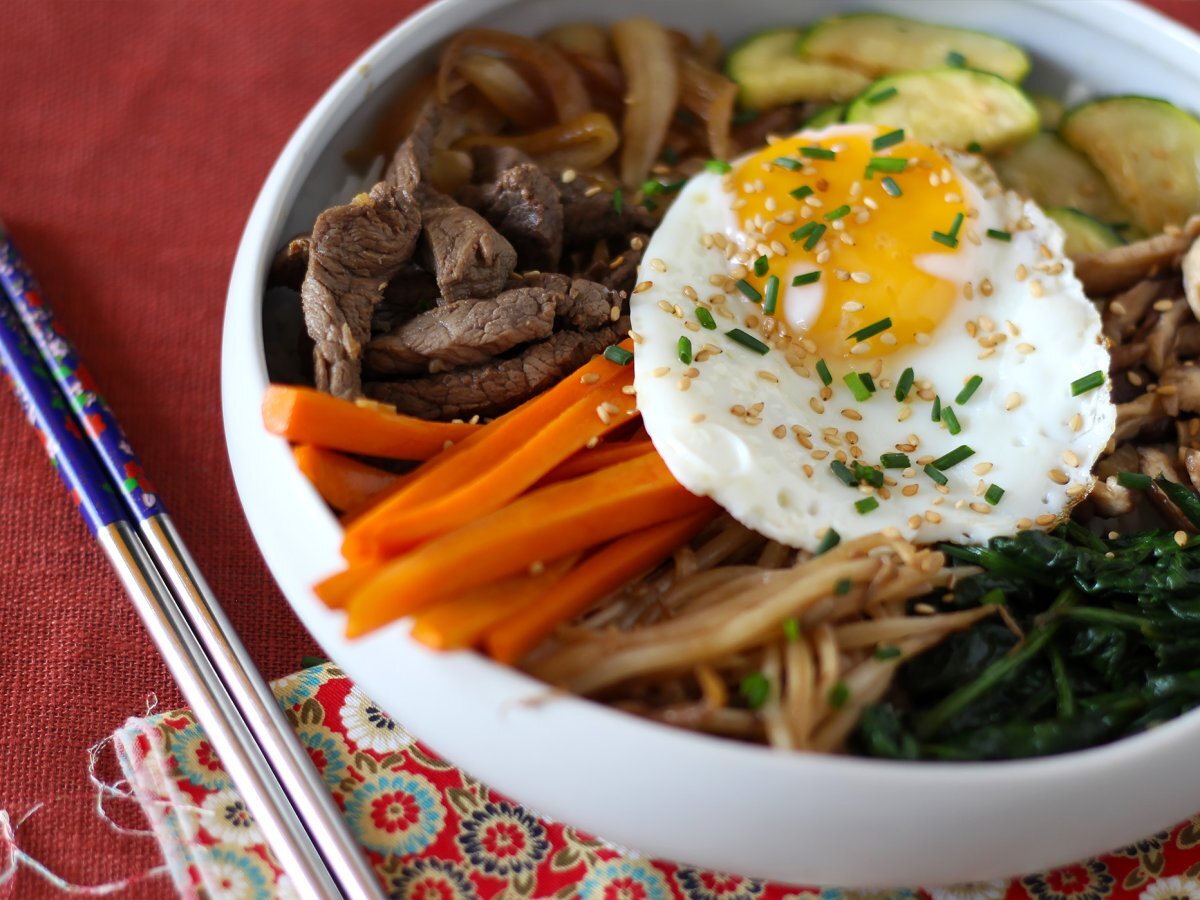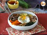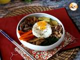 Sie können Ihr Bibimbap mit einem Spiegelei oder einem weichgekochten Ei, aber auch einem Tomago-Ei verschönern. Es wird im Allgemeinen in Japan gegessen und ist ein weich gekochtes Ei, das dann über Nacht in Sojasauce und Mirin (eine Sauce auf Sake-Basis) mariniert wird.
