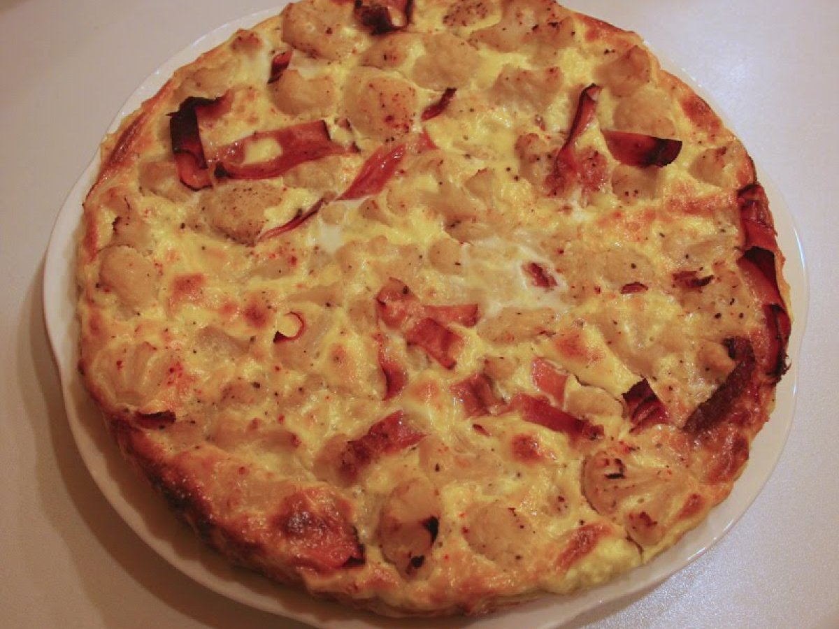 - Blumenkohl-Schinken-Mischung und Streuung auf den Teig.